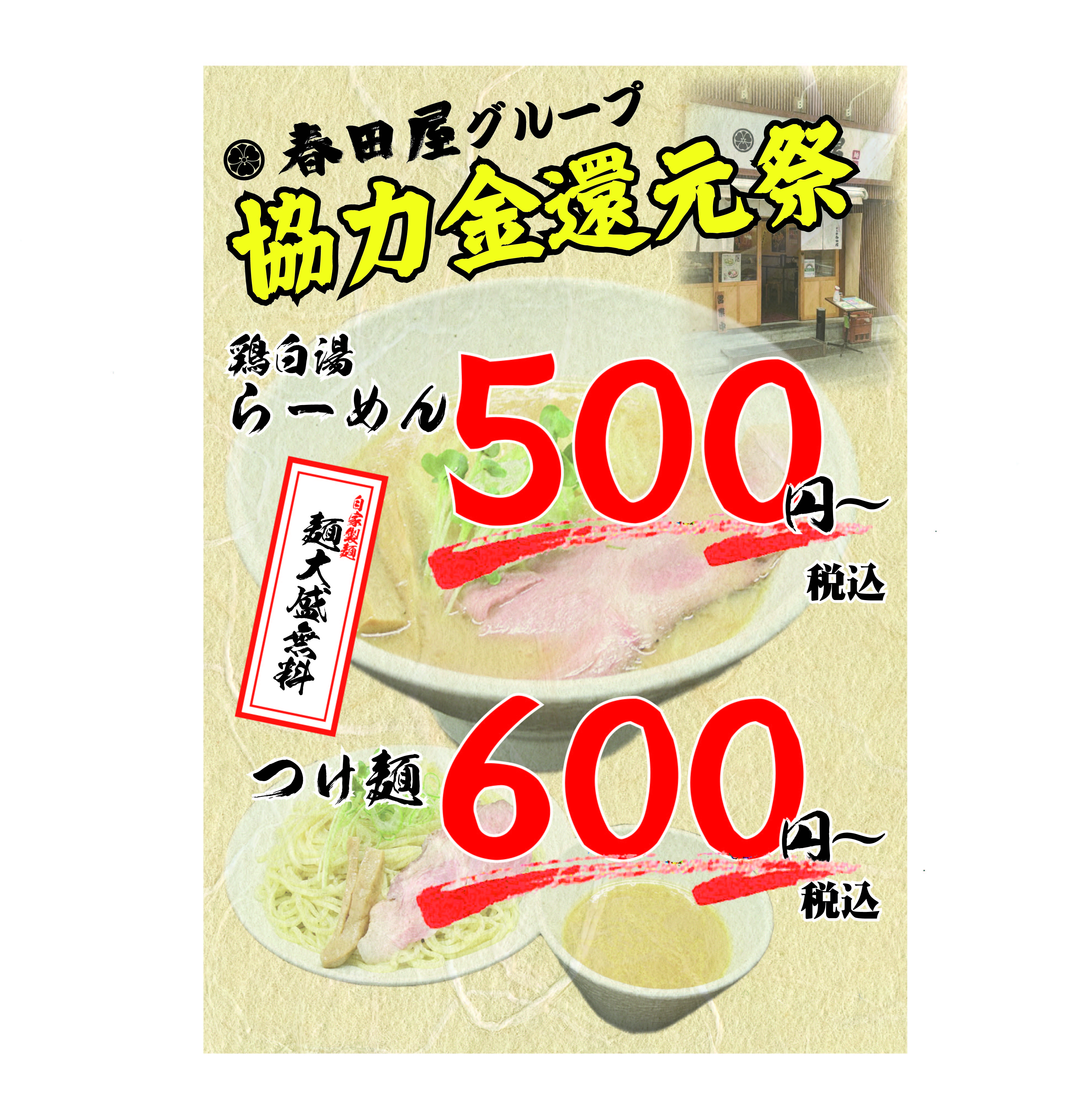 この還元祭で沢山のお客様に「麺処春田屋」の鶏白湯らーめんを気軽に味わっていただき、笑顔になっていただければ幸いです。